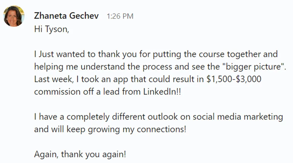 "If you are looking to ramp up your knowledge of how to use LinkedIn to increase business relationships, I highly recommend Tyson!! 🙌🏻 I completed his Linked Life Agent Challenge where he gives actionable steps to take in order to use LinkedIn effectively. He has great energy, wisdom in LinkedIn and Insurance marketing, and is just a good guy. You’ll be glad you did."